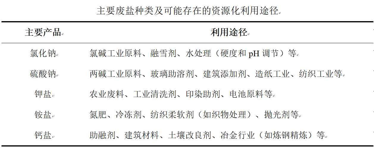 根据废盐的调研结果,在探讨废盐资源化产品的应用途径时,经过处理的盐类物质具有广泛的潜在用途。如表所示,资源化产品如氯化钠和硫酸钠在多个行业中发挥着重要作用。氯化钠,作为氯碱工业的重要原料,广泛应用于水处理、以及作为融雪剂来确保冬季道路安全。硫酸钠则主要在玻璃制造、造纸工业、纺织和皮革加工中充当关键角色,同时也用于建筑行业的混凝土调节剂。钾盐,作为一种重要的农业肥料,为作物提供必需的钾元素,促进作物生长和提高产量。在工业清洗和印染领域,钾盐同样发挥着重要作用,作为清洗剂和印染助剂,提高产品质量和生产效率。铵盐,以其含氮的特性,在农业生产中作为氮肥使用,有助于提高作物的营养摄入和生长。此外,铵盐在冷冻剂、纺织柔软剂和抛光剂等领域也有广泛应用,进一步拓宽了其在工业领域的应用范围。钙盐的应用也同样广泛,作为建筑材料、土壤改良剂以及冶金工业中的电解质或助熔剂。